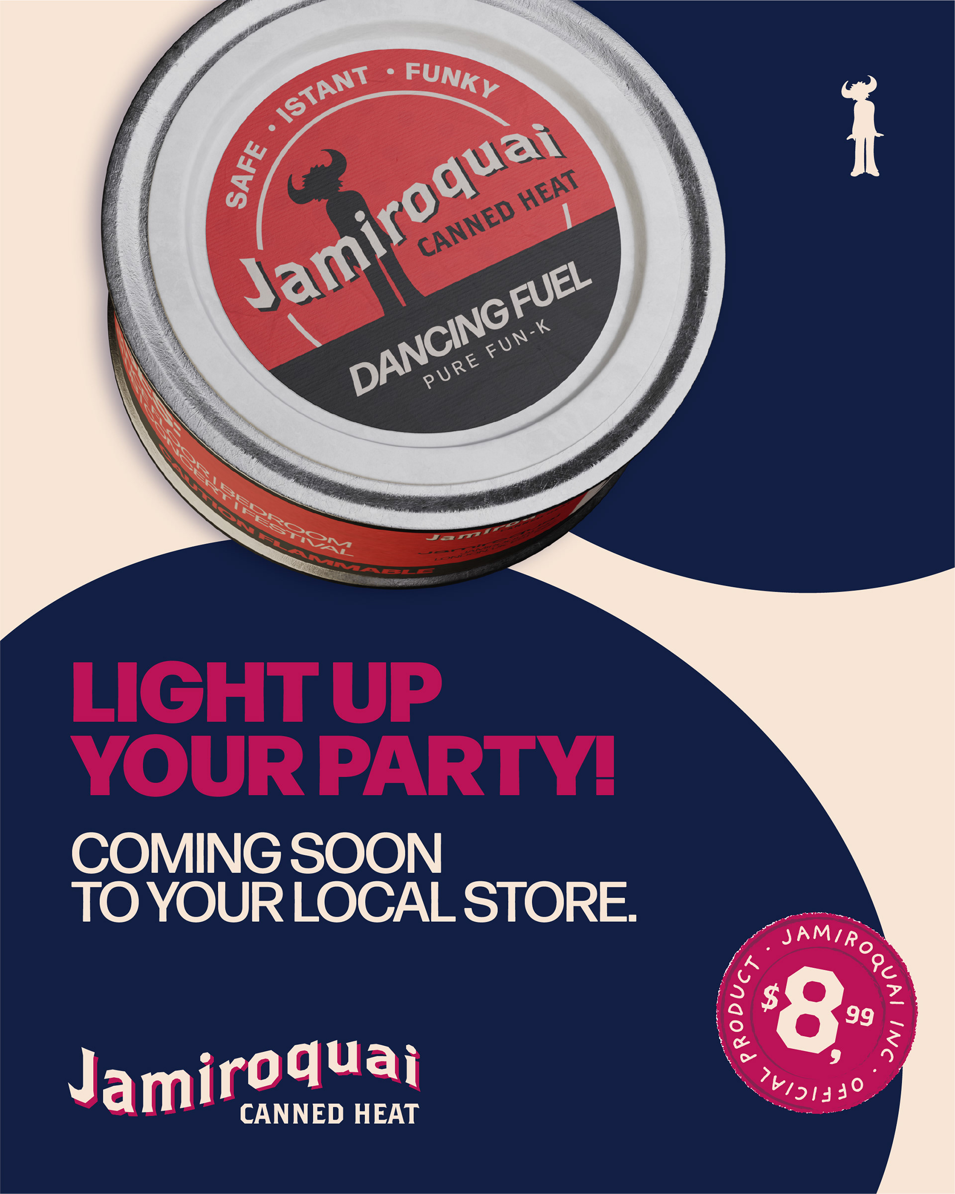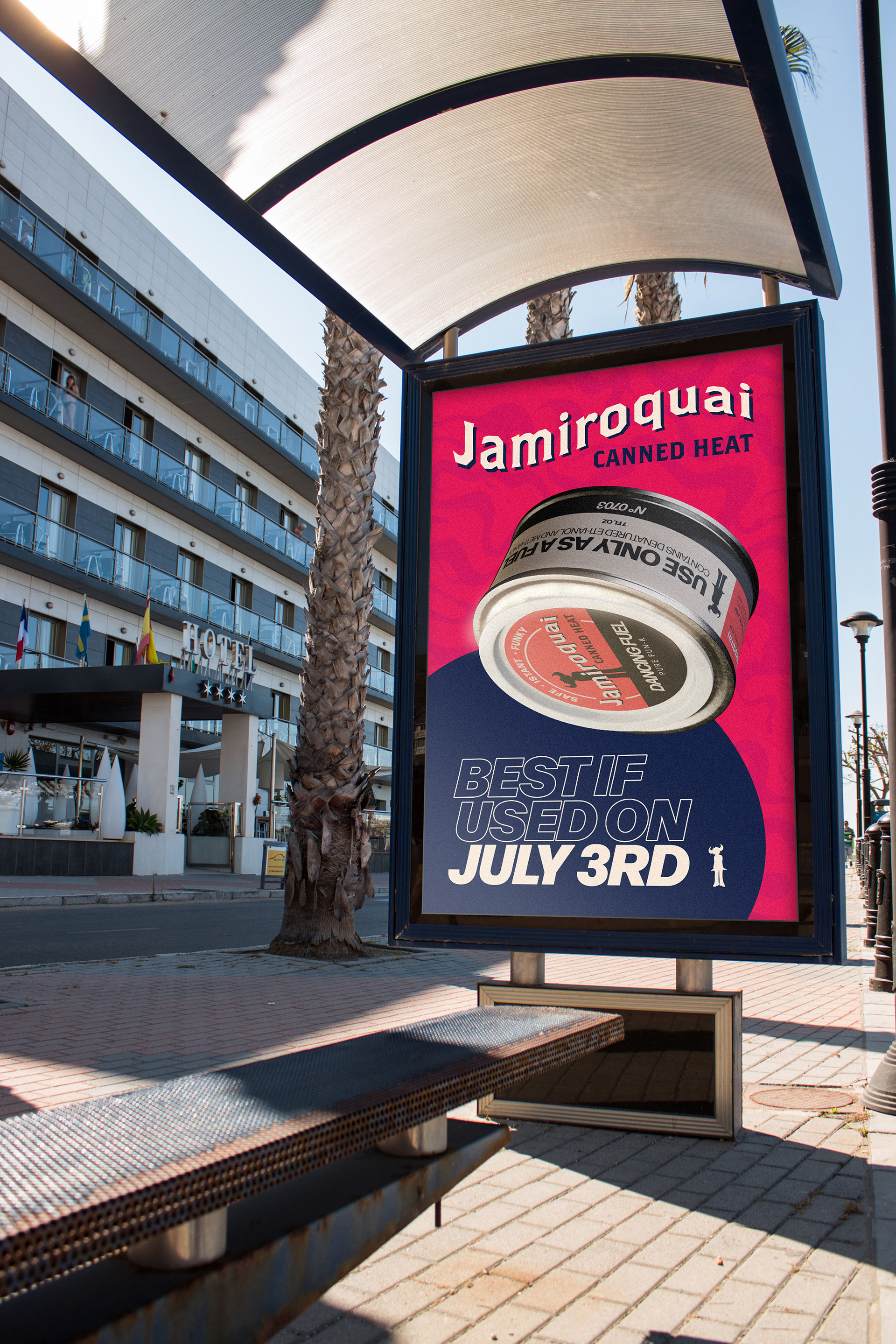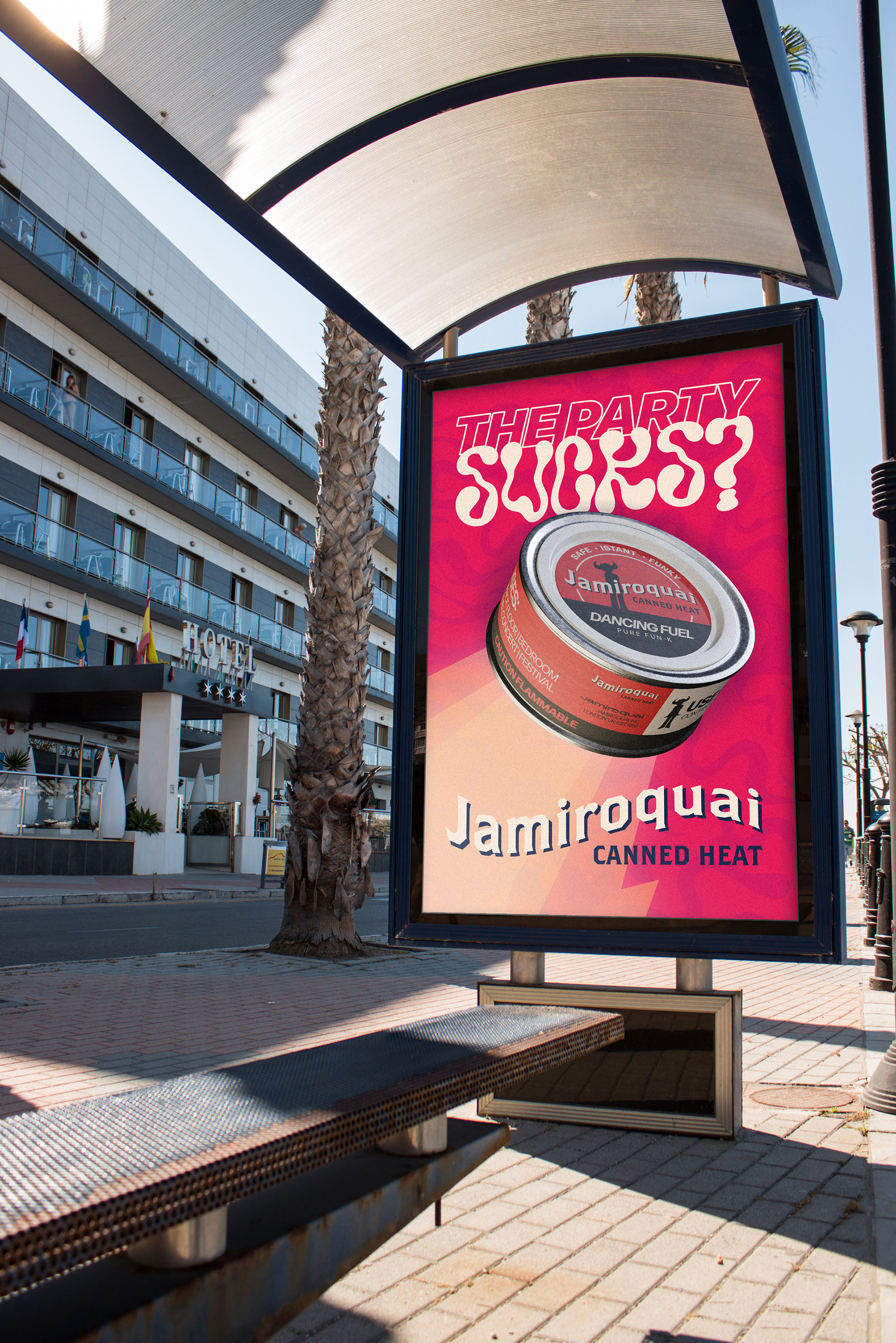 Starting from the title “Canned Heat”, the concept traces back to the origin of this slang term, the historic Sterno brand of canned fuel, to create a Jamiroquai‑branded version of the product: a “dancing fuel” ready to ignite the dance floor.
